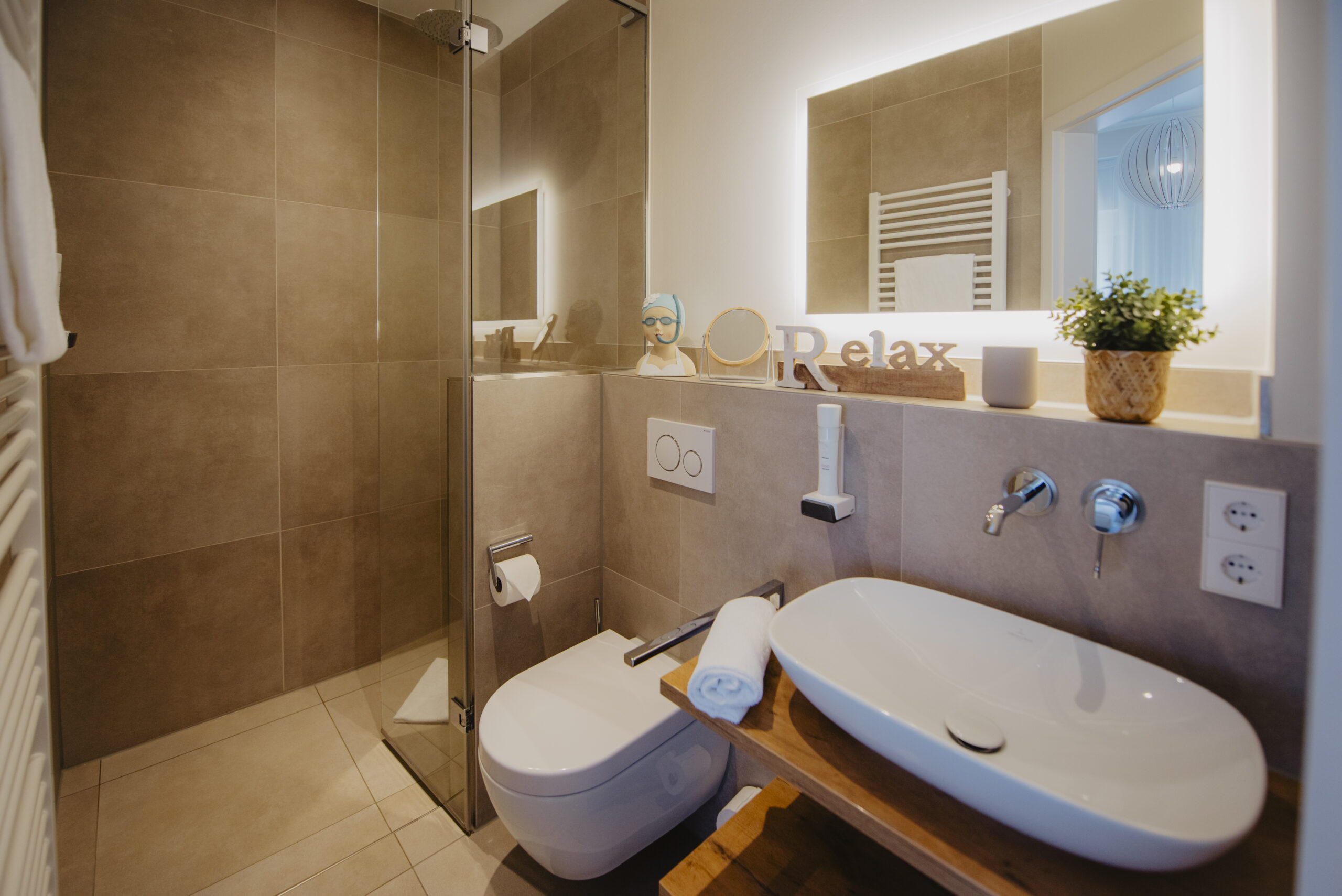 - Badezimmer mit Dusche, WC, Föhn und Fußbodenheizung